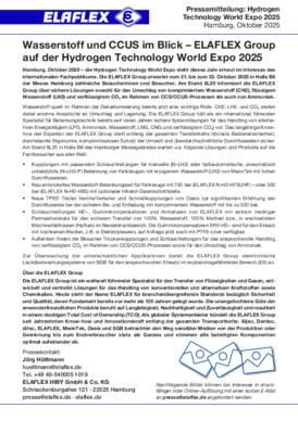 Hamburg, Oktober 2025 – die Hydrogen Technology World Expo steht dieses Jahr erneut im Interesse des internationalen Fachpublikums. Die ELAFLEX Group erwartet vom 21. bis zum 23. Oktober 2025 in Halle B6 der Messe Hamburg zahlreiche Besucherinnen und Besucher. Am Stand 6L20 informiert die ELAFLEX Group über sichere Lösungen sowohl für den Umschlag von komprimiertem Wasserstoff (CH2), flüssigem Wasserstoff (LH2) und verflüssigtem CO₂ im Rahmen von CCS/CCUS-Prozessen als auch von Ammoniak.